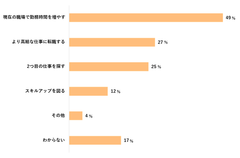 年収の壁について「解消や改革を望む」と回答した方を対象に、年収の壁を気にせず働けるようになった場合、どのような行動を取るか複数回答で聴取した。「現在の職場で勤務時間を増やす」が49%で最も高い。次いで「より高給な仕事に転職する」が27%、「2つ目の仕事を探す」が25%で続いた。