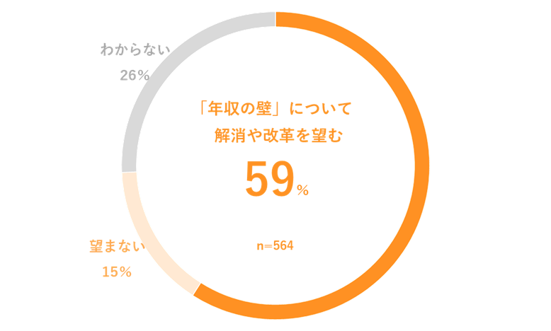 「年収の壁」を認知している方を対象に、年収の壁について解消や改革を望むかを聴取したところ、59%が「解消や改革を望む」と回答した。