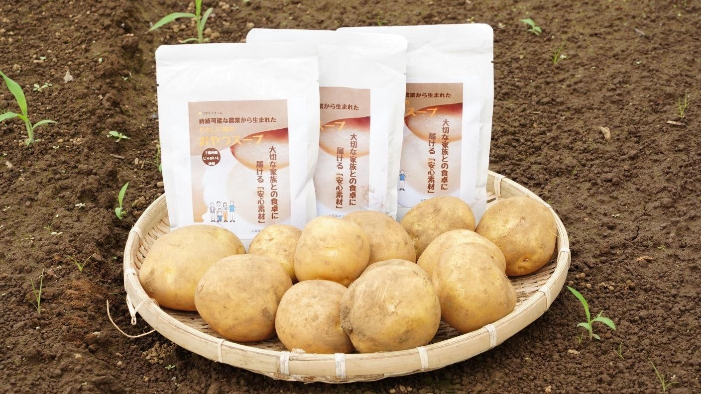 持続可能な農業に挑戦している「つなぐファーム」が、新たな挑戦として初の自社商品「おやつスープ」を生産しました!コンセプトは、大切な家族との食卓に届ける「安心素材」。つなぐファームで採れたじゃがいも「とうや」の味を生かしたやさしい味わいとなっております。