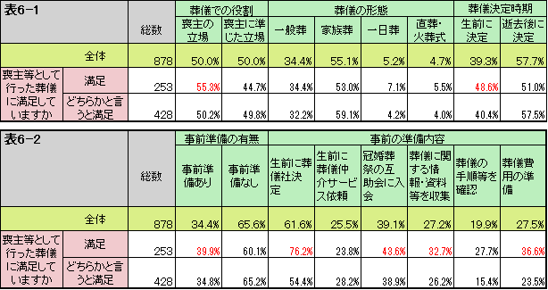 さらに、満足と回答された喪主等が「葬儀での役割」「葬儀の形態」「葬儀の決定時期」をどう実施されていたか、並びに「事前準備の有無」と「葬儀の事前準備の内容」はどうだったかを、各々回答の平均割合より5ポイント以上高い比率を選定(表6-1、表6-2の赤文字)してみると、葬儀施行における高い満足度を得られるパターンが導かれる