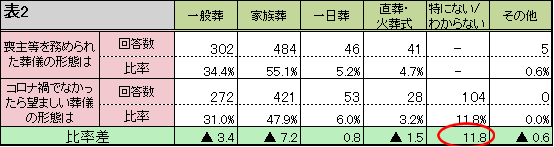 ・さらに、もしコロナ禍でなかったら、望ましい葬儀、したかった葬儀をお聞きしたところ、表2の通り、一日葬を除き大半の葬儀(形態)の比率が低下し、「特にない/わからない」との比率が増加した形となり、現状の葬儀施行は、「コロナ禍で葬儀(形態)が変容していた」だけではない他の要素があるものと考えられる