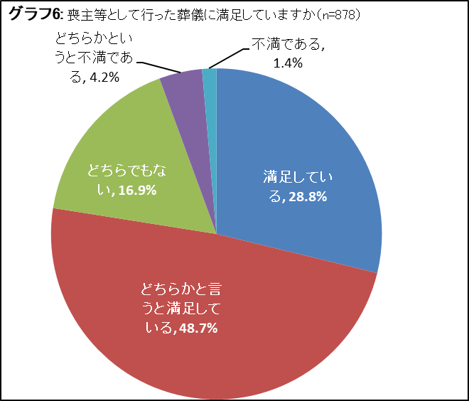 ・喪主等を務められた葬儀について、満足されていたか、不満であったかを聞いたところ、「満足(28.8%)」と「どちらと言うと満足(48.7%)」となり、合計77.5%と不満合計5.6%を大幅に上回っている