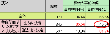 ・葬儀の事前準備に関する質問と上記3.葬儀形態の決定時期とを相関分析してみると、表4の通り、一定の相関はみられるものの、葬儀形態を「生前に決定」されていた方の4割が「事前準備をしていなかった」という結果も認められた