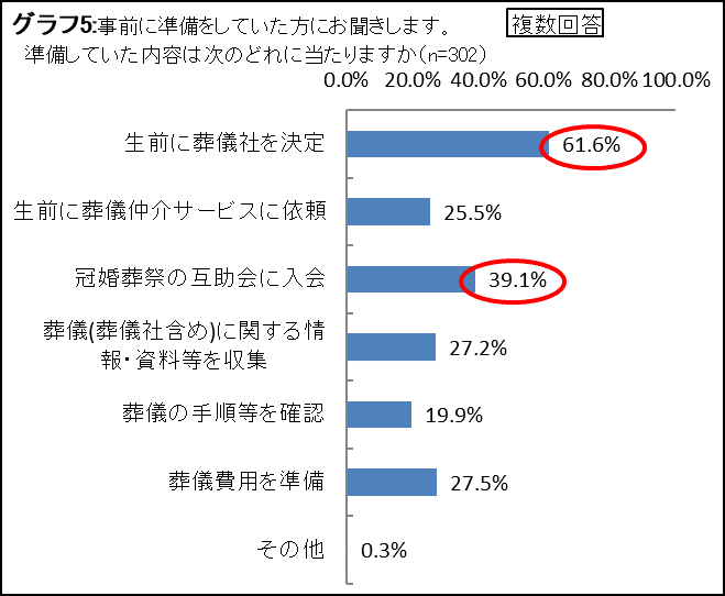 ① 葬儀の事前準備をしていた方に、その準備していた内容を聞いてみると、グラフ5の通り、「生前に葬儀社を決定」されていた方が61.6%と最も多く、続いて「冠婚葬祭の互助会に入会」していた方が39.1%となっている