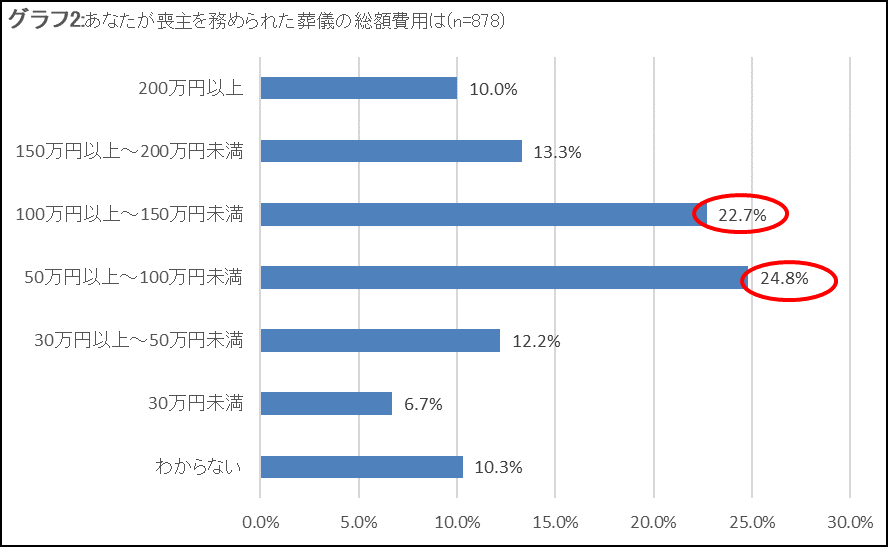 ・喪主等に葬儀の総額費用を確認したところ、グラフ2の通り、「50万円以上~100万円未満」層が最も多く(24.8%)、続いて「100万円以上~150万円未満」層(22.7%)が2番目に多い回答となっている