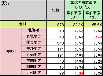 ・さらに、事前準備比率を地域別にみてみると、赤文字数値の通り、葬儀の形態で「一般葬」の比率が高かった「北海道と九州地方」では事前準備比率が高く、逆に事前準備比率が低いのは「東北地方」となっている