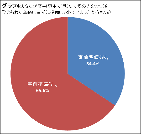・喪主等経験層の方に「事前に葬儀の準備を行っていたか」を聞いたところ、グラフ4の通り、「事前準備していた方」が34.4%、「事前準備していなかった」方が65.6%となっている