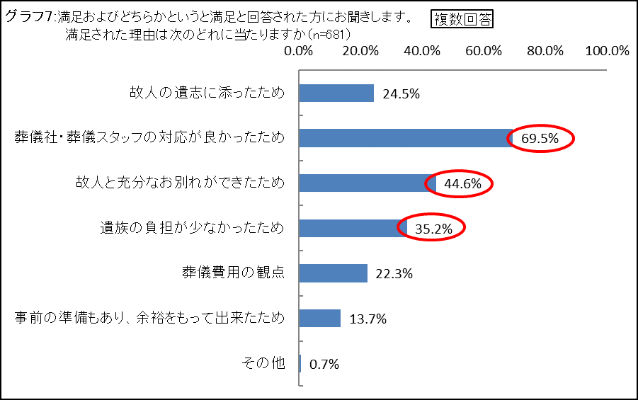 ① 「満足」と「どちらかと言うと満足」と回答された方に満足された理由を聞いたところ、グラフ7の通り、「葬儀社・葬儀スタッフの対応が良かった」が69.5%と最も高く、続いて「故人と充分なお別れができた(44.6%)」「遺族の負担が少なかった(35.2%)」の理由が高くなっている