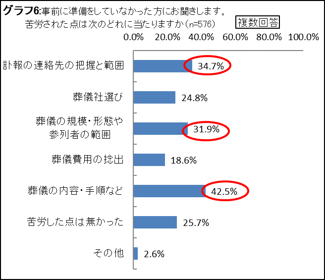 ② 葬儀の事前準備をしていなかった方に実際の葬儀の際、苦労された点を聞いたところ、グラフ6の通り、「葬儀の内容・手順など」が最も多く42.5%、続いて「訃報の連絡先(34.7%)」「葬儀の規模・形態(31.9%)」と葬儀となると最初に決めなければならない点が多く挙げられている