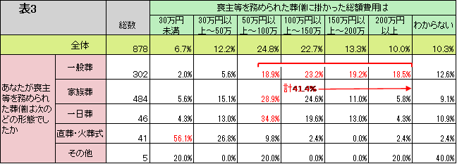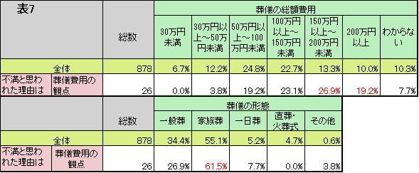 さらに、不満合計の母数が49名と少ないため、最も多い回答理由となった「葬儀費用の観点」にのみ焦点を当て、回答された方(26名)の「葬儀の総額費用」と「葬儀の形態」を確認してみると、表7の赤文字通り、比較的高価格帯であったことと、葬儀形態は「家族葬」で多くなっているという結果であった