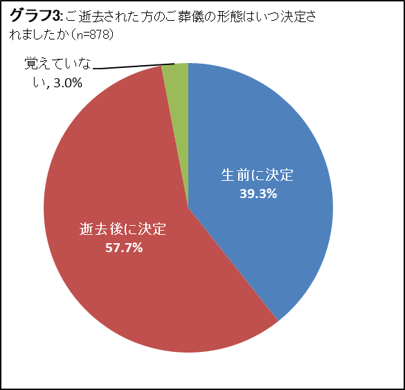 ・通常、葬儀に関しては、ご逝去後に決定する事項が多く、慌ただしく進むと言われている。そこで「喪主を務められた葬儀の形態はいつ決定されたか」を聞いたところ、グラフ3の通り、「逝去後に決定した」方が57.7%と多数ではあるが、「逝去前に決定した」方も39.3%と約4割近い方が生前に決定されている事がわかった