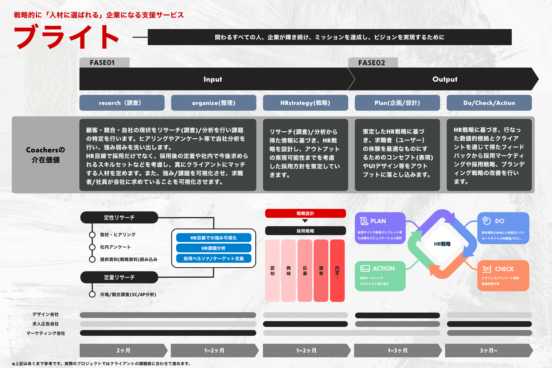 経営者の想いやビジョンをもとに、その企業にしか語れない独自の採用コンセプトをつくり、求職者のインサイトを理解した上でともに採用戦略を立案。より多くの人に『共感』されるコミュニケーション(アウトプット)を設計します。PDCAを回しながら企業に最適化した採用マーケティング施策をワンストップで提供します。