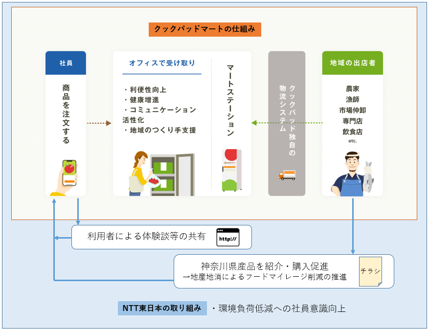 環境負荷軽減の取り組みの一環として、社員による「クックパッドマート」を通じた神奈川県産品の購入を促進することで地域の生産者に貢献するともに、地産地消<*1>およびフードマイレージ<*2>の削減等への社員意識を高め、NTTグループの新しい環境エネルギービジョン「NTT Green Innovation toward 2040」<*3>の実現につなげていきます。
