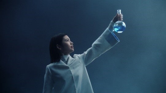 白衣をまとった小芝風花さん。強い眼差しで「世の中や人を思う気持ち…」と語り始めます。神秘的な空間の中、静止した研究員たちの間を颯爽と歩き、その先で襲いかかる「巨大な手」に対峙します。そして「一歩踏み出す勇気があれば!」とフラスコを掲げ、「世界は変えられる」と立ち止まっている研究員たちを鼓舞。「さあ、挑戦しよう!」の言葉と同時に、光に向かって研究員たちと共に走り出します。最後は、「さあ、熱くなれ。シーシーアイ。」とシーシーアイが持つ研究開発への熱意、マインドを伝えます。