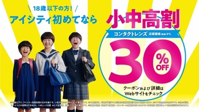内容: 18歳以下でアイシティ初めてなら、コンタクトレンズが店頭価格(税抜)から30%OFF。