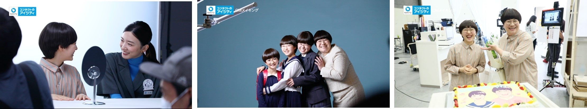 本CMでは、コンタクトレンズについて豊富な知識を持つアイシティの店頭スタッフ「瞳のプロフェッショナル」役に永野さんが初挑戦。また近藤さんは、娘のコンタクトデビューを果たすためにアイシティに訪れる、ある親子のお母さん役として初登場。近藤さんに見た目がそっくりな娘役と一緒に“そっくり親子”を演じます。娘のコンタクトデビューに対してお母さんが抱いている不安や心配を、「瞳のプロフェッショナル」が徹底サポートすることで解消し、安心感と期待感をもって娘がコンタクトデビューを遂げるというストーリーです。近藤さんの背後から娘役が突如現れ、「近藤春菜じゃねーよ!」と言い放った瞬間、永野さんは含み笑い。冷ややかな視線を送る親子に対する、「やっちゃった」と言わんばかりのお茶目な表情にご注目ください。