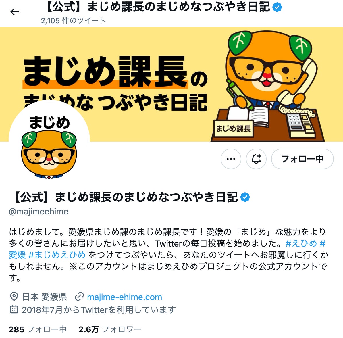 まじめえひめ公式Twitterでは、愛媛の「まじめ」な魅力を多くの人に届けたいと思った、「まじめえひめ」イメージキャラクターである“まじめ課長”がアカウントの運用を担当し、知る人ぞ知る愛媛県の情報やイベント情報などを毎日投稿しています。