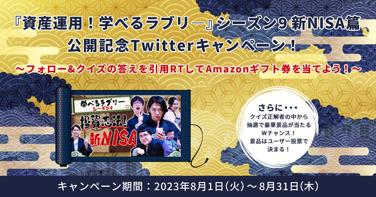 松井証券(以下「当社」)は、本日8月1日(火)より、YouTube動画コンテンツ『資産運用!学べるラブリー』の新シリーズ「新NISA篇」の公開を記念してTwitterキャンペーンを開始いたしました。