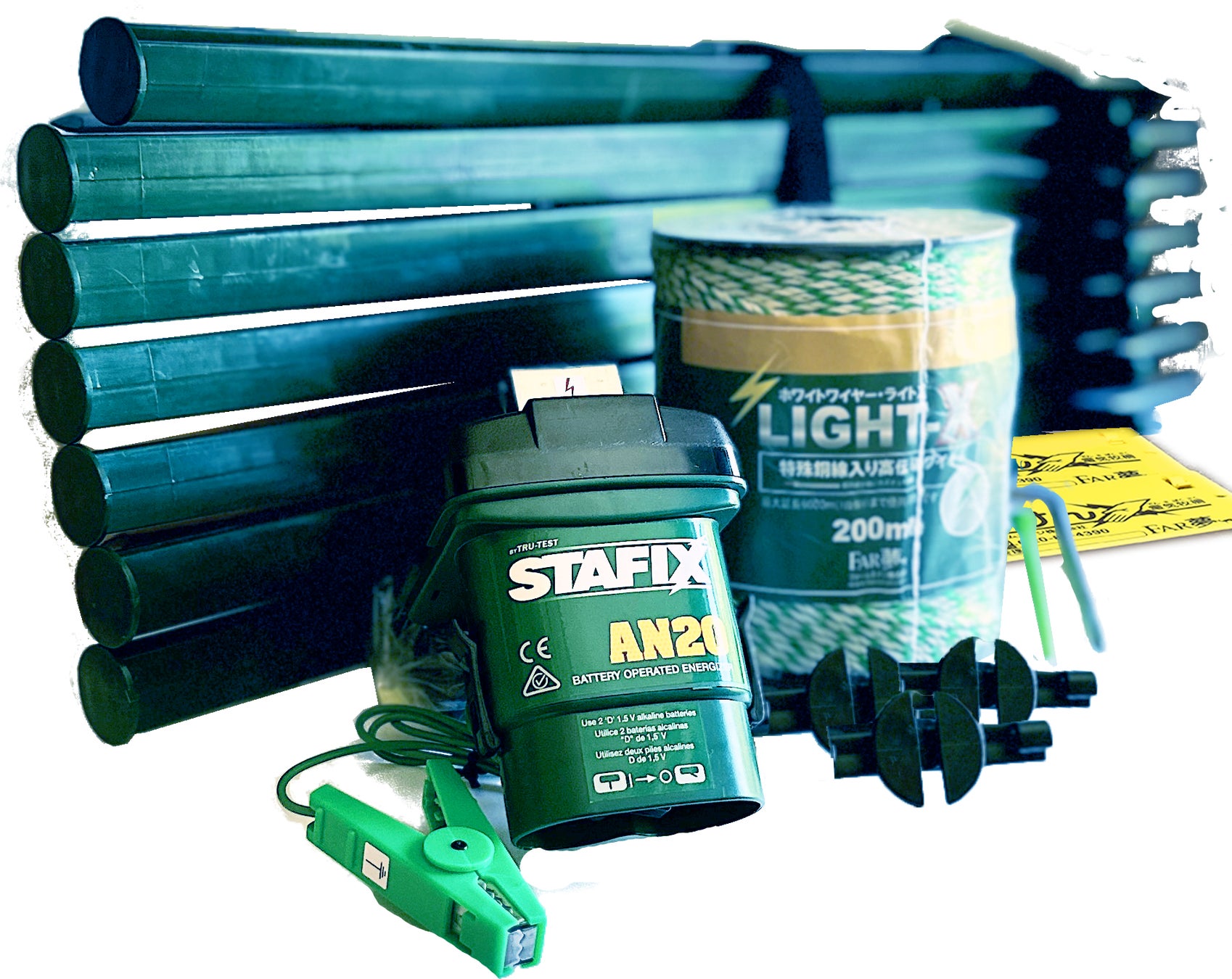 ●特 徴 : 15分程度で設置でき、乾電池(単一)で使用可能な個人が簡単に設置できる電気柵。外周約50メートルを囲うことができ、電線にはパルス電気が流れ、主に電線に触れた熊やイノシシ等に対して驚かせて追い払うことが可能。人間が触れても強めの静電気が流れる感覚で、お子様が触れてもケガや火傷はしにくいもの。