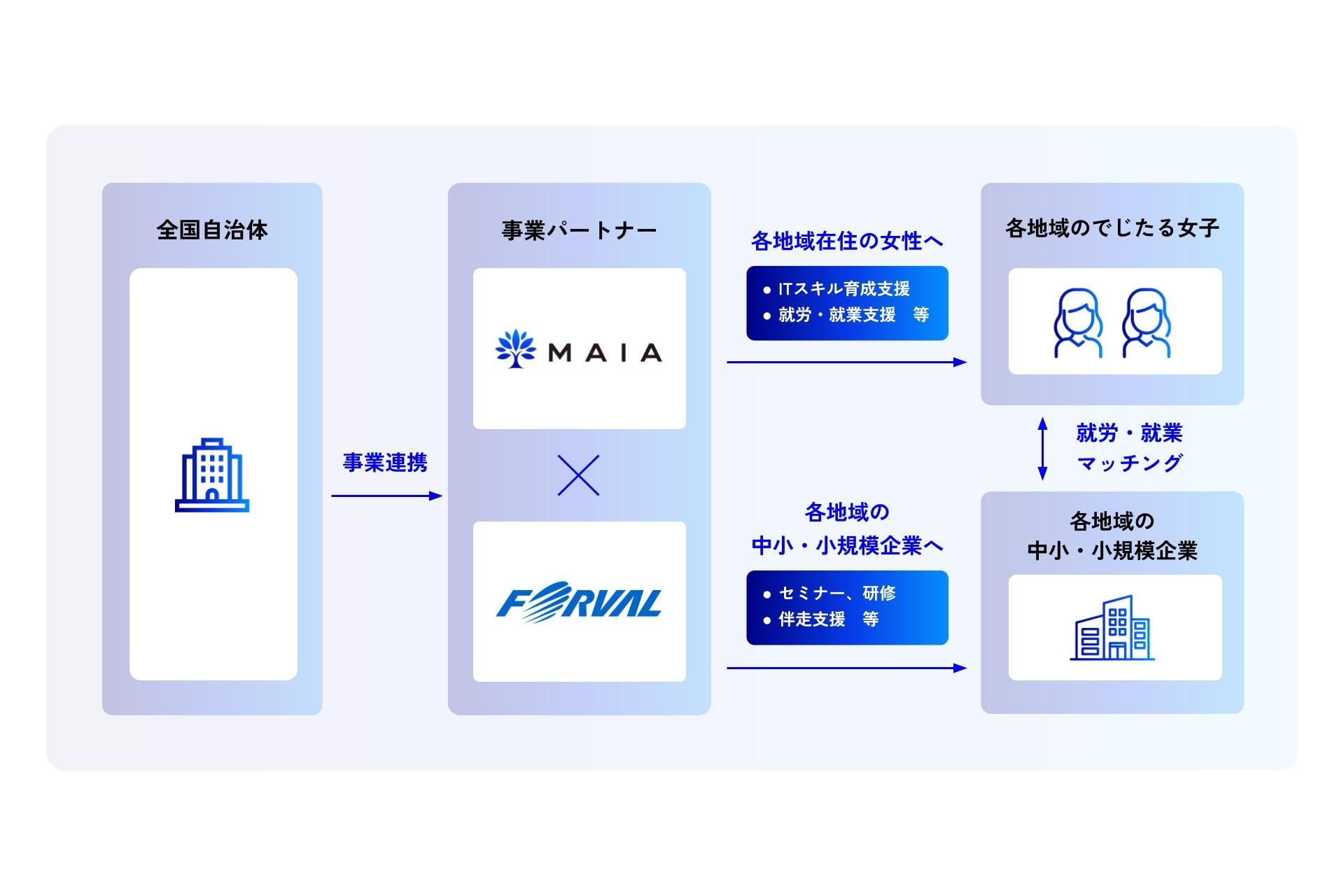 本プロジェクトでは、これらの課題を解決するため、全国の中小・小規模企業43,000社に対して、DX化の伴走支援を実施しているフォーバルと、全国の自治体と連携した「でじたる女子プロジェクト」などを通じて女性のITスキル習得支援やキャリア支援を行うMAIAが協働し、さまざまな地域の中小・小規模企業へ女性の就労・就業に関わるマッチングや支援を行い、地方のDX化推進、雇用創出と多様な働き方を推進する自治体としての価値向上を図ります。