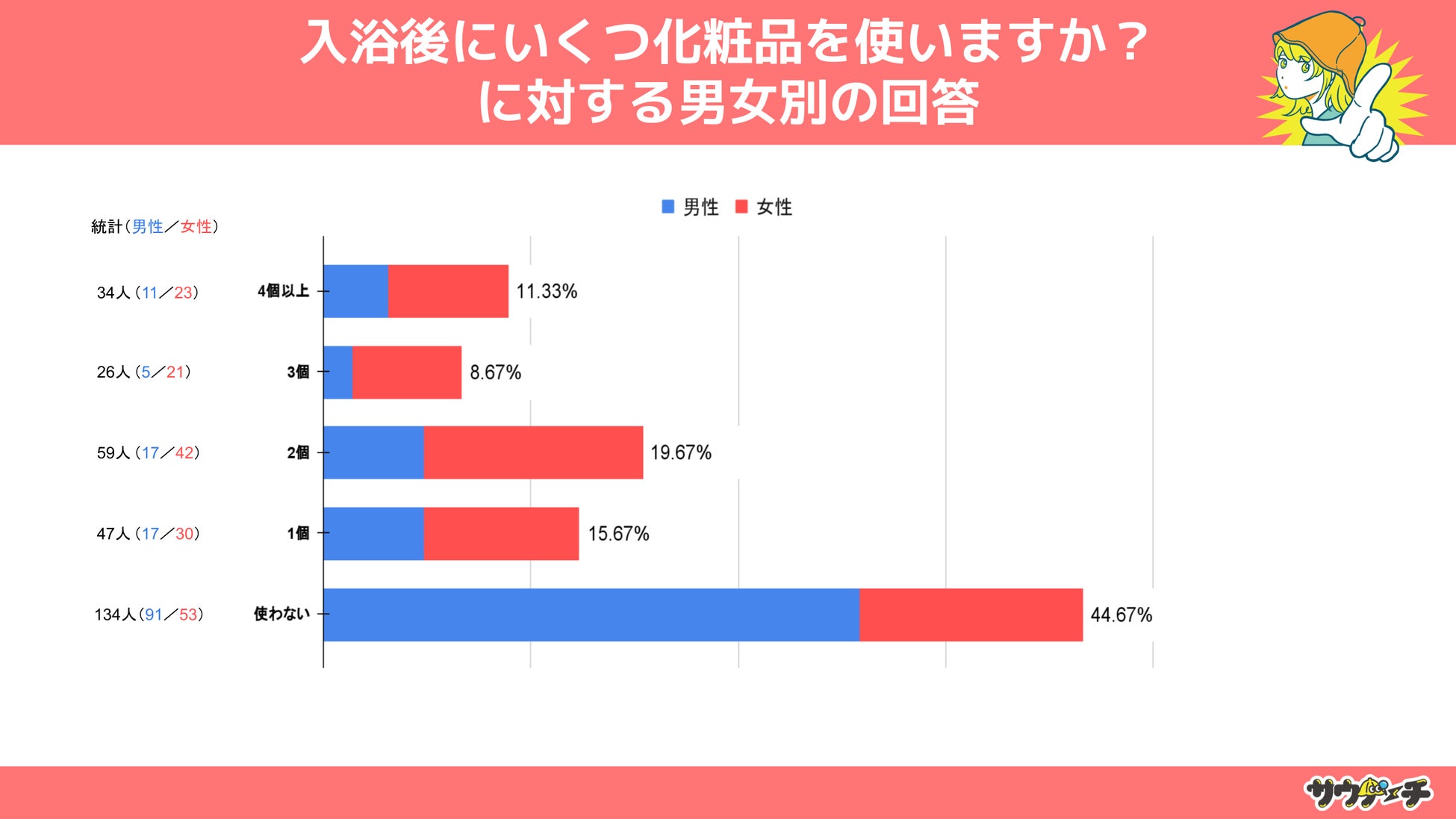 10~30代男女を対象とした「入浴後にいくつ化粧品を使いますか?」というアンケートで最も多かった回答は「使わない」で44.67%でした。