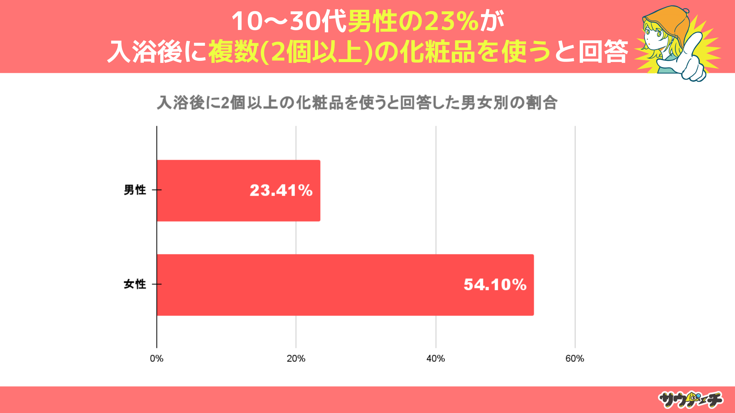 入浴後に2個以上の化粧品を使うと回答した割合を男女別でみてみますと、男性が23.41%、女性が54.1%という結果になりました。