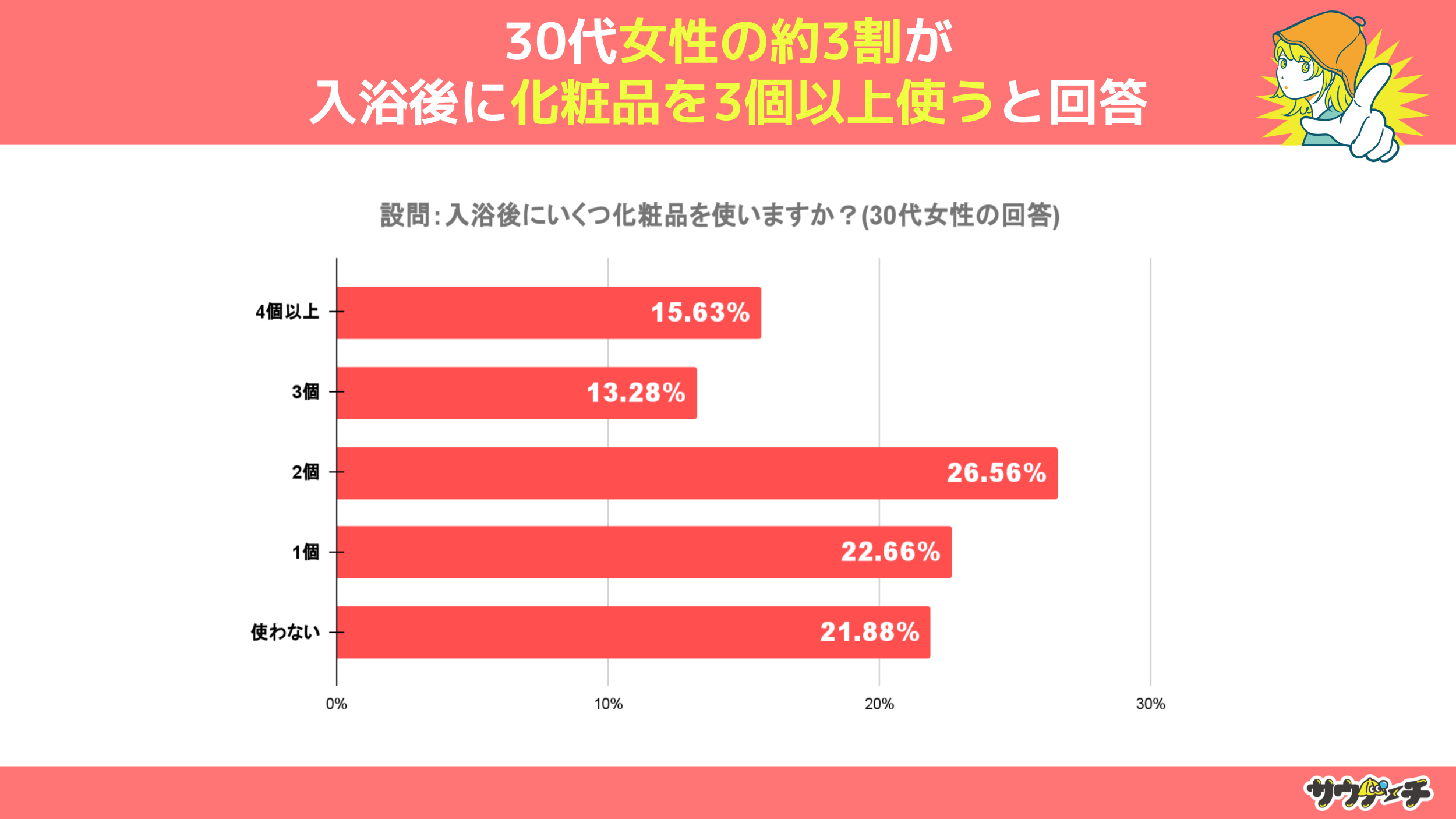 また30代女性の回答を見てみますと、「4個以上」という回答が15.63%、「3個」が13.28%で、入浴後に3個以上化粧品を使うと回答した方は全体の3割に及びました。