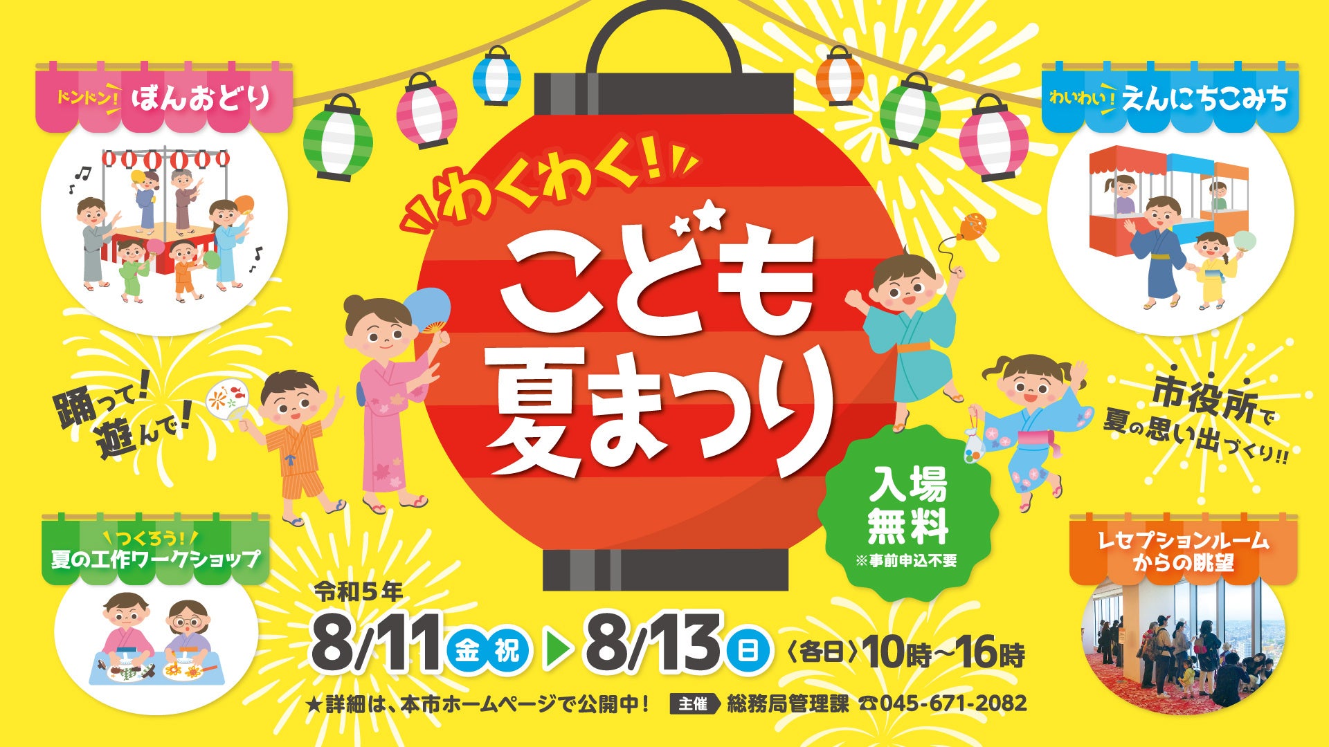 8月11日(金・祝)~13日(日)の3日間、横浜市役所で、「わくわく!こども夏まつり」を開催します。アトリウムには「やぐら」が出現!盆踊りで体を動かしてみたり、和太鼓を叩いてみたり、縁日でスーパーボールすくいや輪投げなどで遊んだり、横浜市役所が、夏祭りならではの体験を楽しむことができる空間に大変身!お子様とご一緒に、夏の思い出づくりにぜひお越しください。