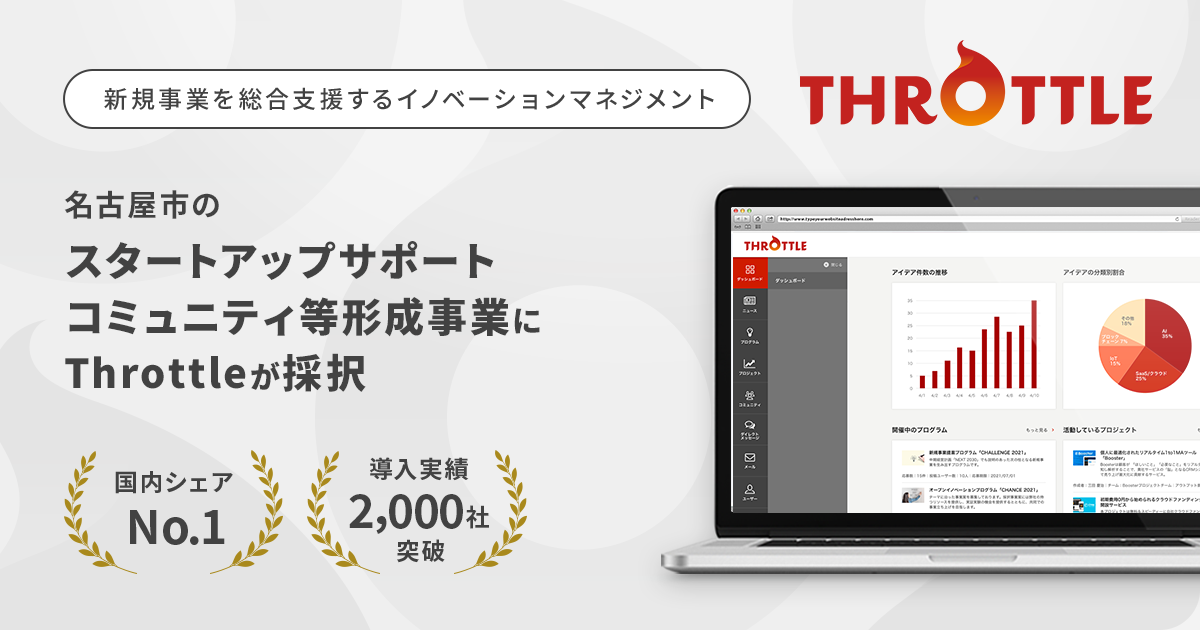 Throttleは新規事業創出プログラムや社内ベンチャー制度、オープンイノベーションやアクセラレーションプログラム等を含む、すべての新規事業開発やイノベーション創出のための活動に最適化された国内初にして国内シェアNo.1(※)SaaS型イノベーションマネジメント・プラットフォームです。今後の日本企業においてイノベーションマネジメントの概念や手法が普及し、新規事業創出への取り組みを試みる企業が増加していくと想定される中、新規事業開発やオープンイノベーションにおけるアイデア創出から事業化に至るまでの一連のプロセスを一元的に管理・運用できる仕組みとテクノロジーを提供することで、挑戦する企業や組織の支援を行うことを目的に2019年8月より提供を開始しました。これまでに2,000社以上に導入され、5万人以上のユーザーに利用されるなど、国内シェアNo.1の導入・利用実績を誇ります。