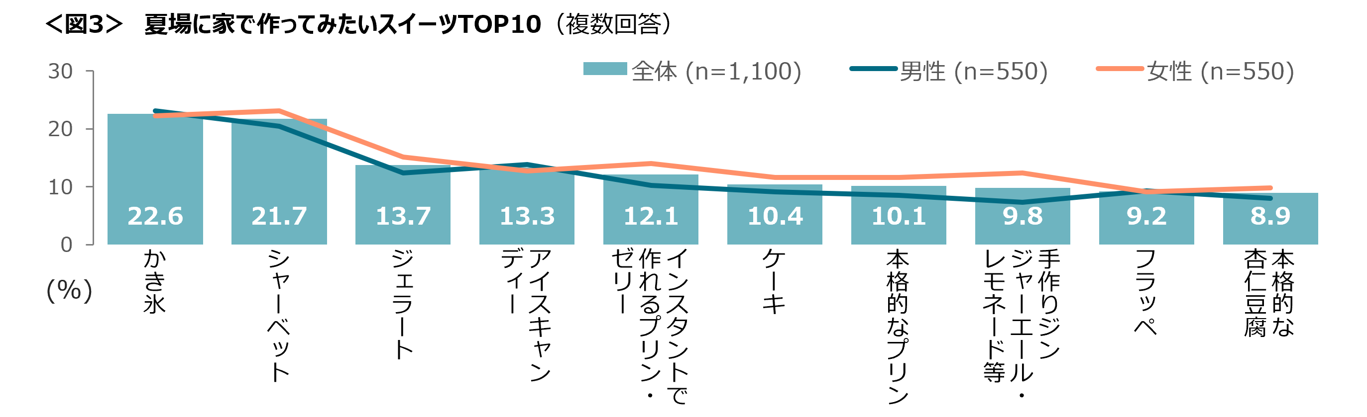家で作ってみたいスイーツは「かき氷」が22.6%で最も高く、僅差で「シャーベット」が21.7%で続く。<図3>
