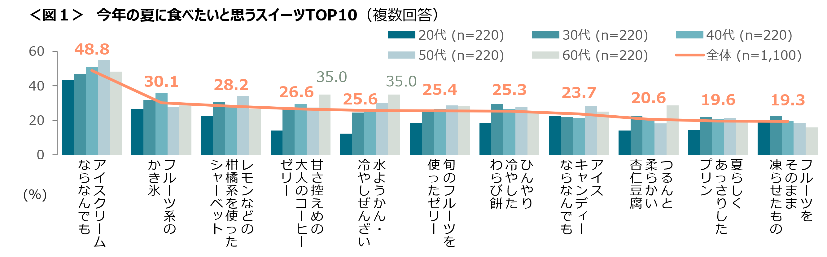 今年の夏に食べたいと思うスイーツは「アイスクリームならなんでも」が半数でTOP。「フルーツ系のかき氷」が3割で続く。<図1>