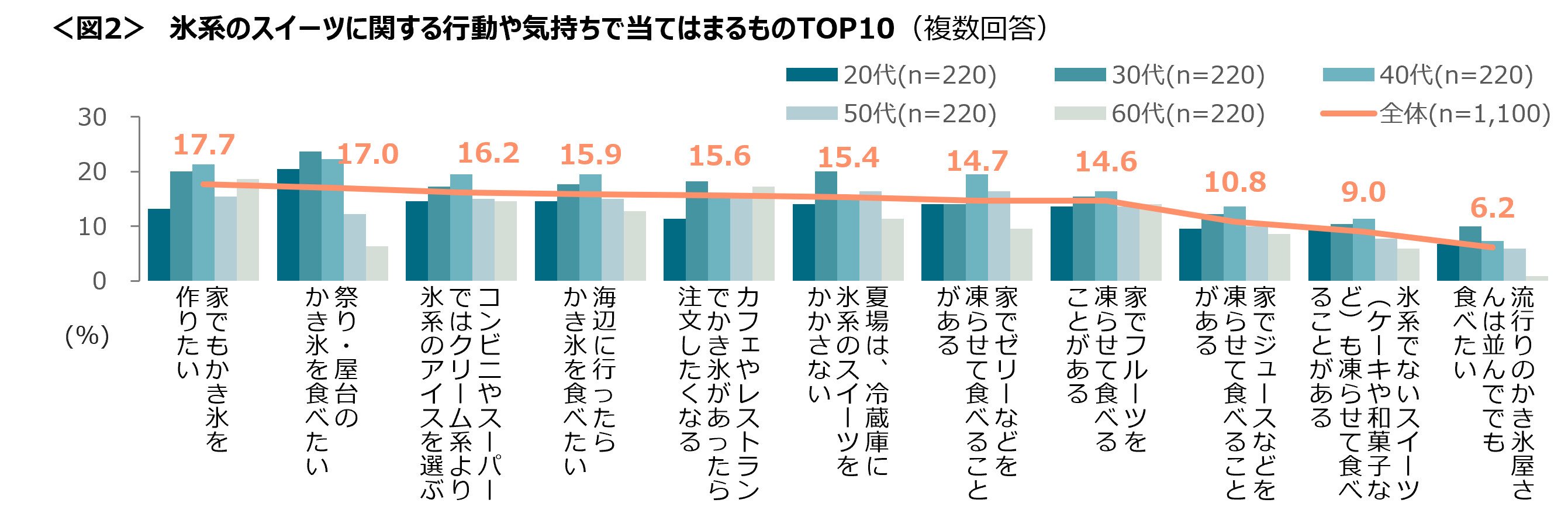 氷系のスイーツに関する行動や気持ちでは「家でもかき氷を作りたい」「祭り・屋台のかき氷を食べたい」とかき氷関連の回答が上位にあがった。<図2>