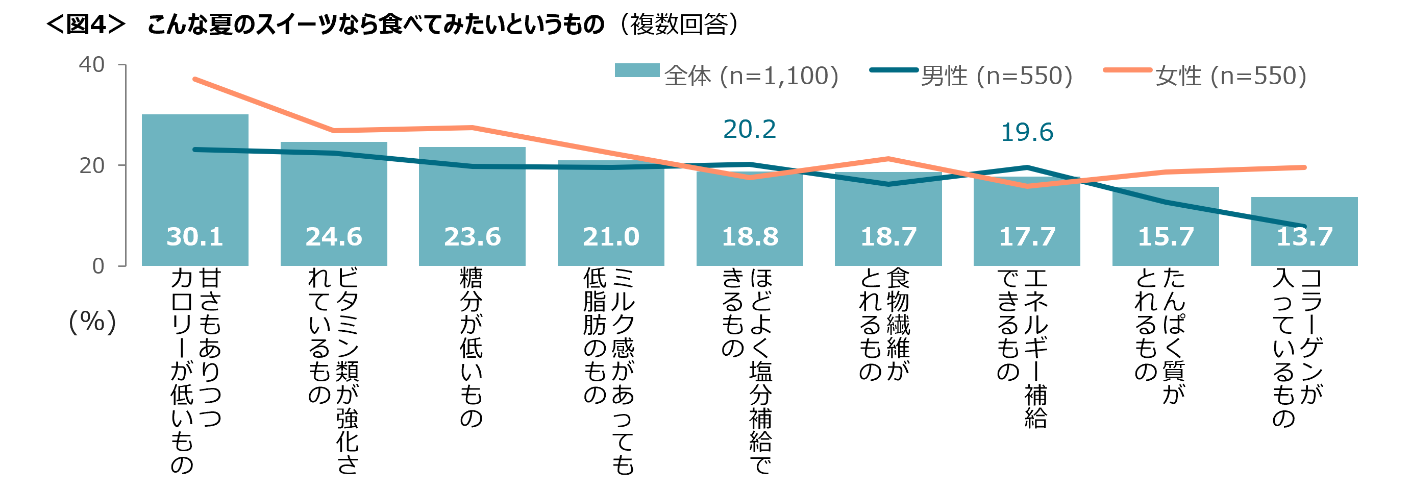 こんな夏のスイーツなら食べてみたいものでは「甘さもありつつカロリーが低いもの」がトップ。<図4>