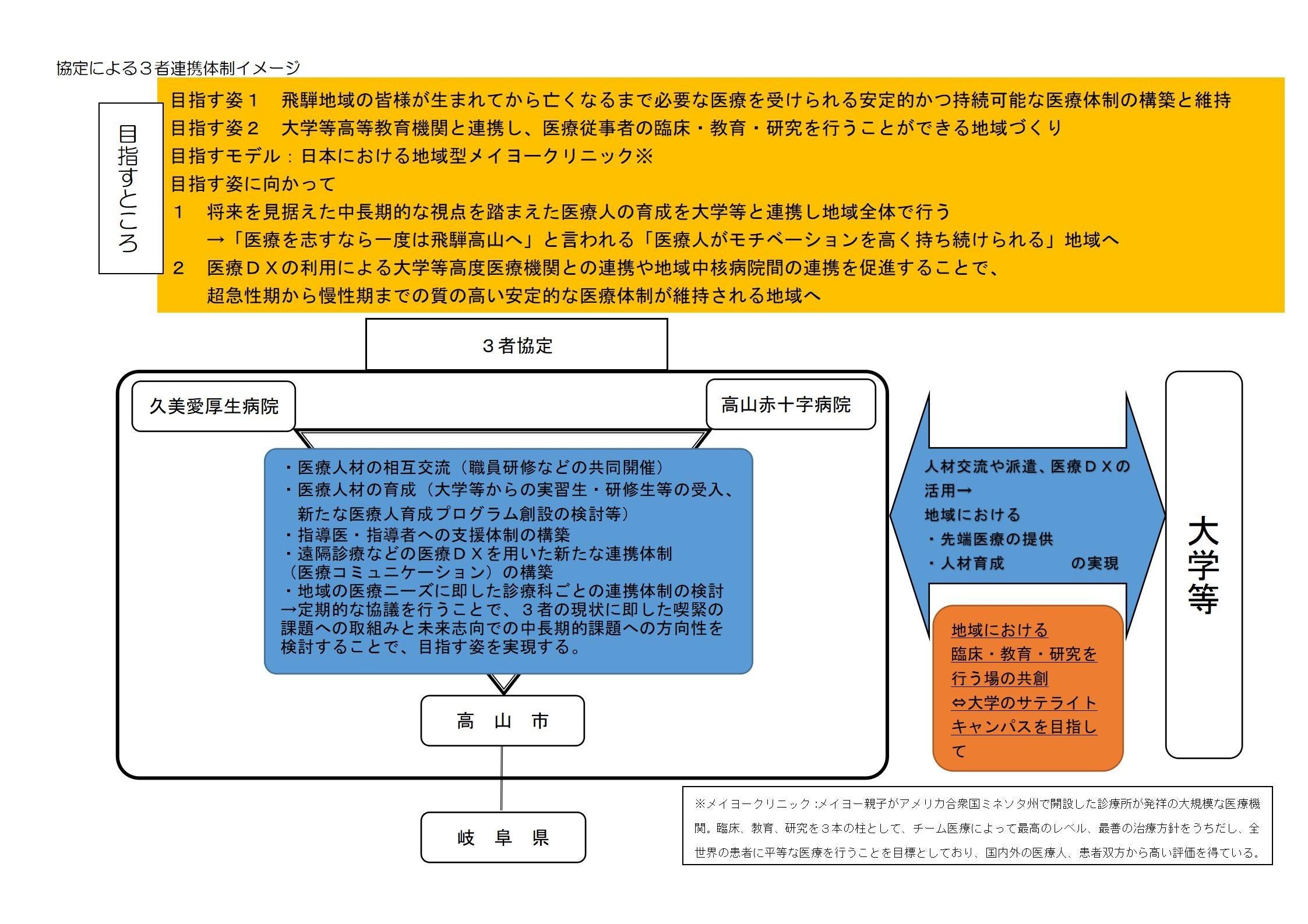 また、他にも、アメリカの田舎(地方)にある小さなクリニックから患者第一主義を掲げ、医療人材の育成に積極的に取り組むことで世界有数の医療機関、教育機関と評価されている「メイヨークリニック」を目標として、最終的にはこの飛騨高山の地で、日本における地方型メイヨークリニックの実現を目指すとも力強く宣言しました。
