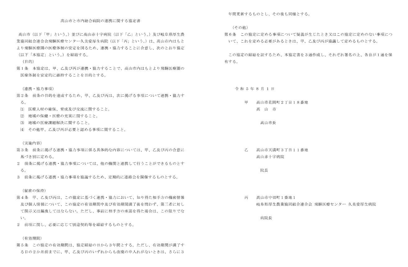 高山市は、令和5年8月1日、市内にある総合病院(高山赤十字病院、久美愛厚生病院)と連携に関する協定を締結しました。
