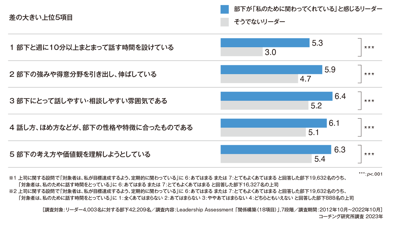 部下の目標達の支援には、部下が「上司は自分のために時間を取ってくれている」と感じることが鍵となることから、コーチ・エィが提供するエグゼクティブ・コーチングにおけるリーダーの過去10年間にわたるデータ(2012年10月〜2022年10月) から、部下が「自分のために関わってくれている」と感じる上司と、そう感じない上司との行動を比較しました(図)。両者の間で差が特に大きかった上位5項目は以下のとおりでした。