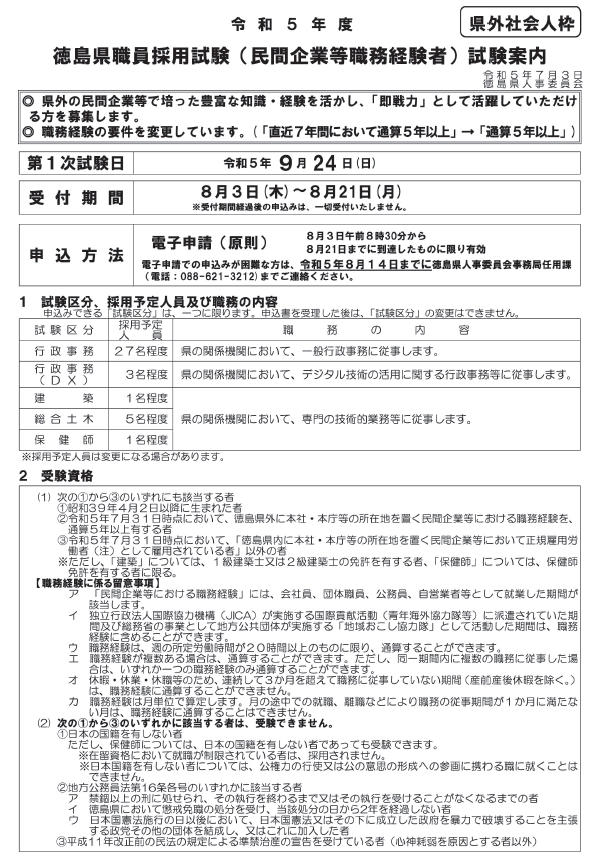 令和6年度 徳島県職員採用試験(民間企業等職務経験者)試験案内【申込終了】|徳島県職員採用案内