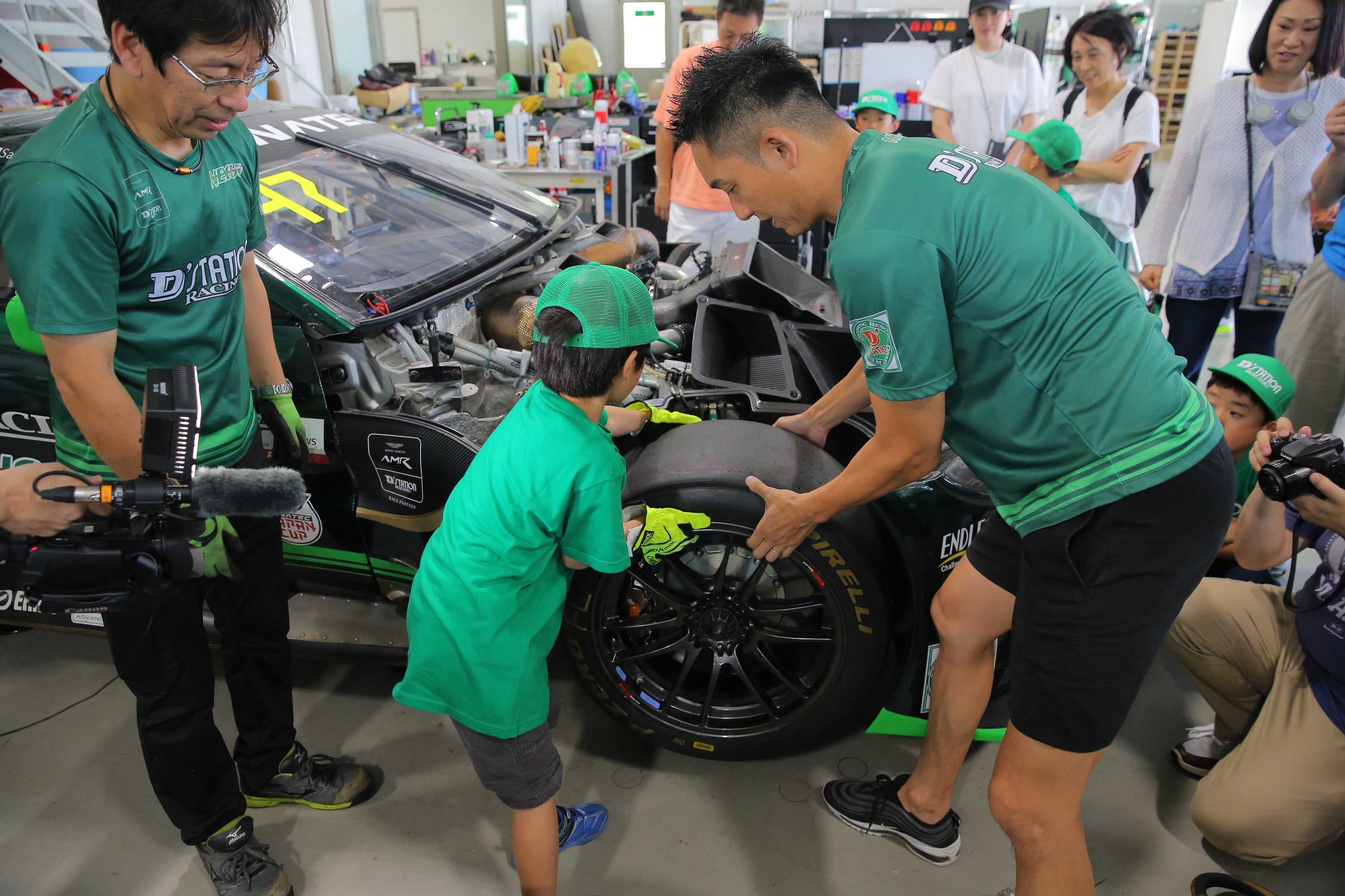 整備体験した車両は、アジア最大の国際チャンピオンシップレース「GTワールドチャレンジ・アジア・ジャパンカップ」に参戦している #47 D’station Vantage GT3 を用意。チームメカニックによる、スピーディーなタイヤ交換の実演披露や、お子様にもタイヤ交換体験に挑戦していただきました。