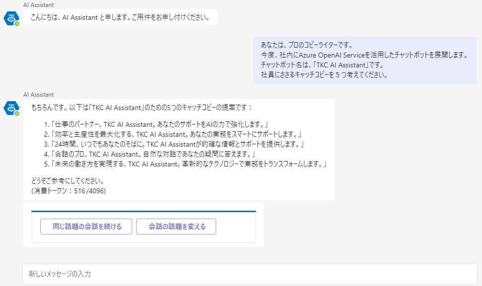 株式会社TKC(本社:栃木県宇都宮市、代表取締役社長:飯塚真規)は、7月20日から「TKC AI Assistant」の利用を開始しました。これは、Azure OpenAI Serviceの大規模言語モデルを使用して開発したTKC独自の社内向けAIチャットサービスです。