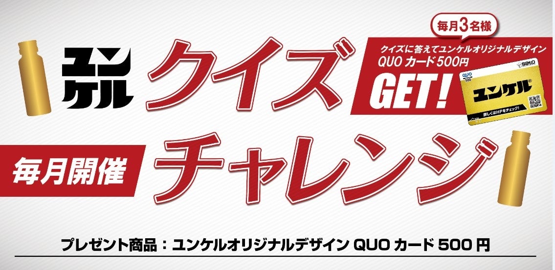 ユンケルブランドサイトにて、ユンケルに関連するクイズを毎月1問出題。クイズ正解者の中から抽選で毎月3名様にユンケルオリジナルQUOカード500円分が当たります。