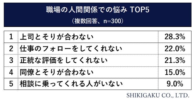 次に職場での人間関係の悩みについて聞いてみると、最も多かったのは「上司とそりが合わない」で28.3%、次いで「仕事のフォローをしてくれない」22.0%、「(人間関係において、好き嫌いなどで)正統な評価をしてくれない」21.3%でした。