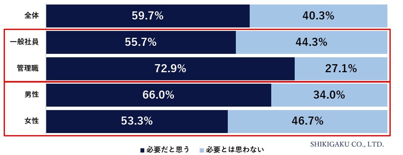 20代~50代の従業員数10名以上の企業にお勤めの会社員に、職場に友達が必要だと思うかを聞いたところ、「必要だと思う」は59.7%でした。またその中で「一般社員」と「管理職」の内訳をみると友達が必要だと回答した「一般社員」は55.7%なのに対し、「管理職」は72.9%と立場の違いで友達の必要性に大きな差が出ました。また男女での内訳も見てみると、男性は友達が必要が66.0%に対し女性は53.3%と、女性の方が職場の友達の線引きを少しシビアにしていることがうかがえました。