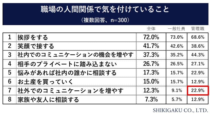 最後に職場での人間関係をよくするために行っていること、気を付けていることについて聞いてみると、「挨拶をする」が最も高く72.0%、次いで「笑顔で接する」が41.7%、「社内でのコミュニケーションの機会を増やす」が37.3%でした。職場の人間関係においてはやはり基本的なことが重要のようです。またこの設問でも役職別でみると「社外でのコミュニケーションを増やす」は「管理職」では22.9%と、「一般社員」の9.1%よりも倍以上の差がありました。