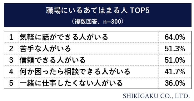 では職場の人間関係において、どのような人が多いのでしょうか。最も多かったのは「気軽に話ができる人がいる」で64.0%でした。次いで「苦手な人がいる」51.3%、「信頼できる人がいる」51.0%と、苦手な人と信頼できる人は、ほぼ同じ数字という結果でした。