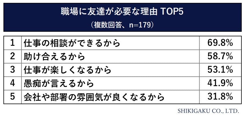 職場に友達が必要な理由…「仕事の相談ができるから」69.8%、「助け合えるから」58.7%