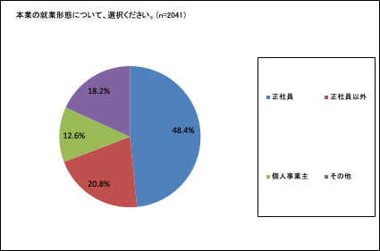回答は、正社員が48.4%、正社員以外が20.8%、個人事業主が12.6%、その他が18.2%でした。
