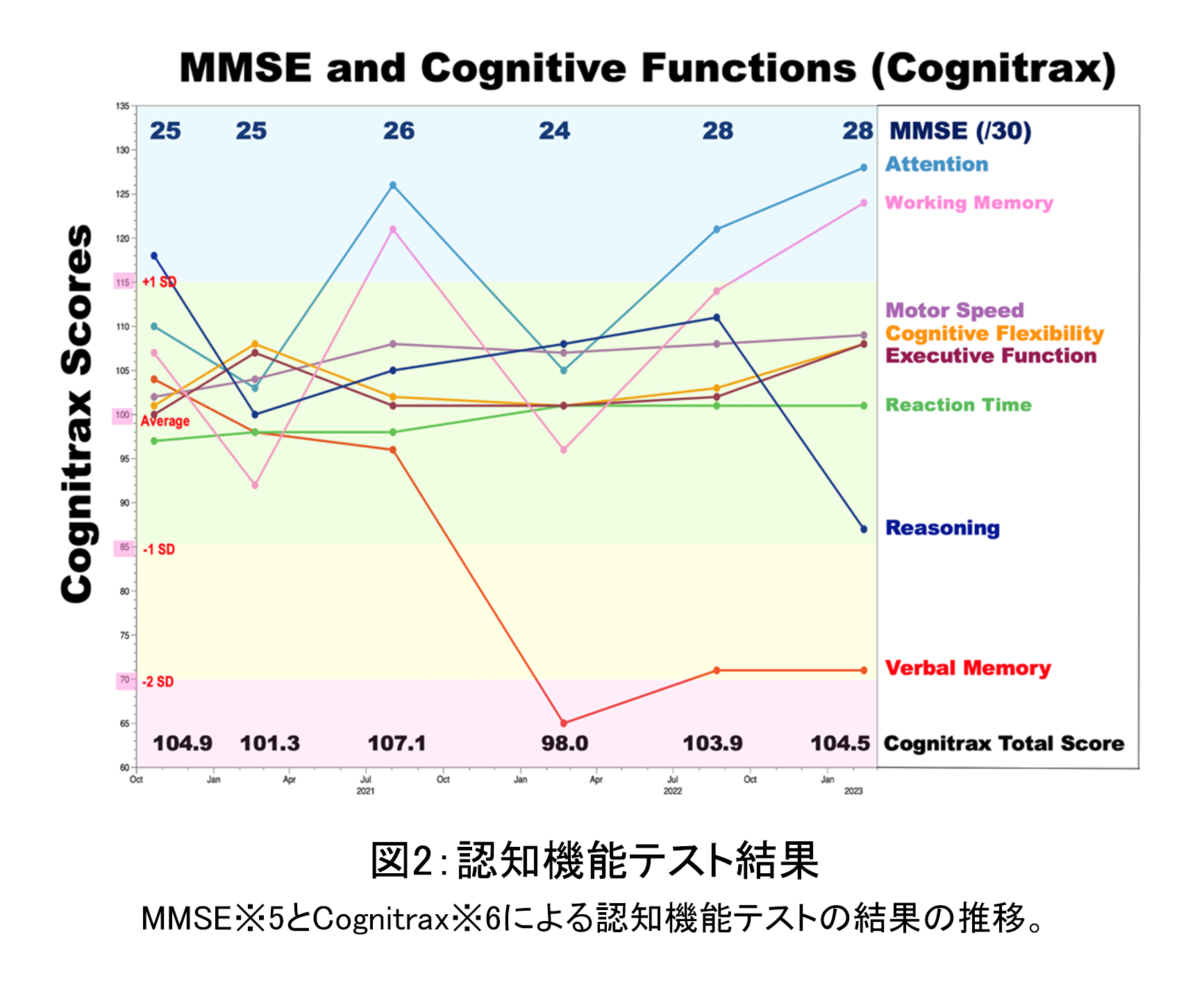 軽度の記憶機能障害を発症した本症例の70代女性AD患者では、APOE ε4/ε4対立遺伝子(ADの最も強力な遺伝的危険因子)を有するにもかかわらず、同年代の典型的なAD症例に比べて症状が軽い傾向がありました。この患者に対して、サイトカインによる神経再生治療を行った結果、萎縮した海馬の再生が観察され、認知機能の改善などが認められました(図2)。