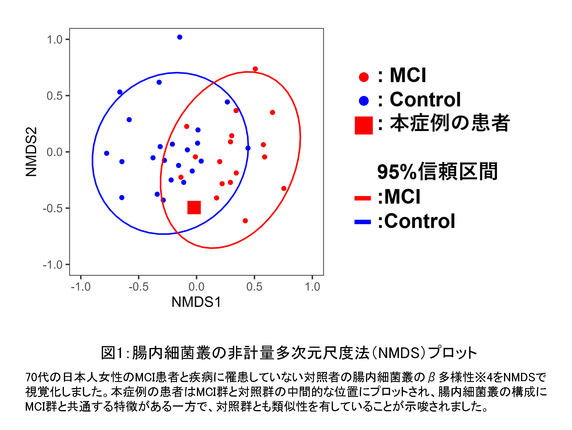 本症例の患者の腸内細菌叢を解析したところ、MCIに特徴的な腸内細菌叢の異常(dysbiosis)が観察されましたが、その程度は他のMCI患者よりも軽度でした(図1)。このような腸内細菌叢の状態により、ADの進行が抑制され、結果としてMCI症状が軽くなった可能性があります。