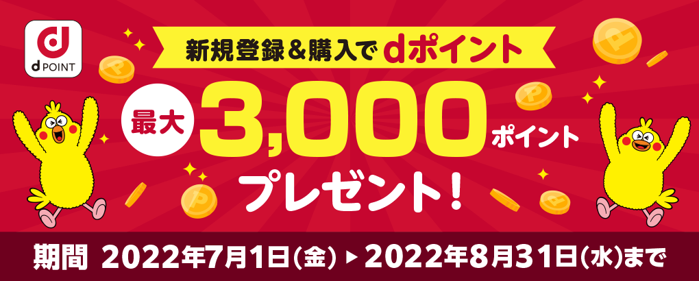 2022年8月31日(水)まで、「新規登録&購入でdポイント最大3,000ポイントプレゼント」キャンペーンを開催しています。