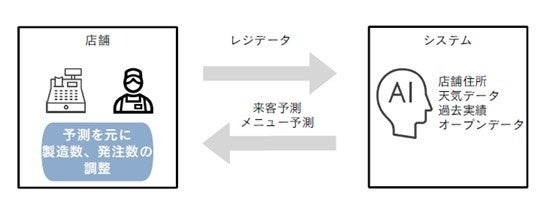 日々の売り上げや来店数、天気、気温、カレンダー情報などを元にAIシステムが各々の店舗の来店予測と需要予測を行い、その予測を参考に仕入れや仕込みを行うことで食品ロス削減に効果があるか実証します。